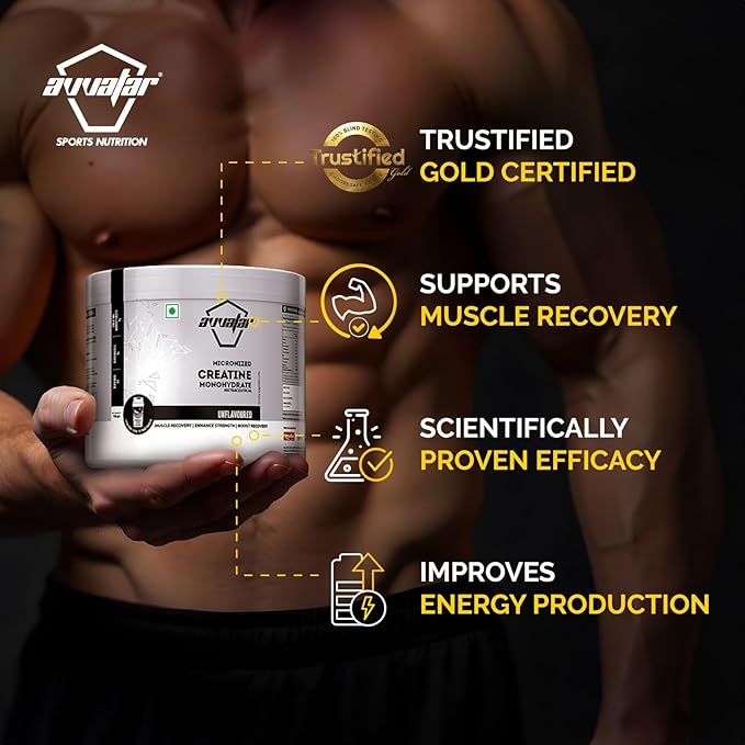 About Avvatar Micronized Creatine Monohydrate Powder (100G, 33 Servings) | Unflavoured | Muscle Recovery | Enhance Strength | Boost Recovery