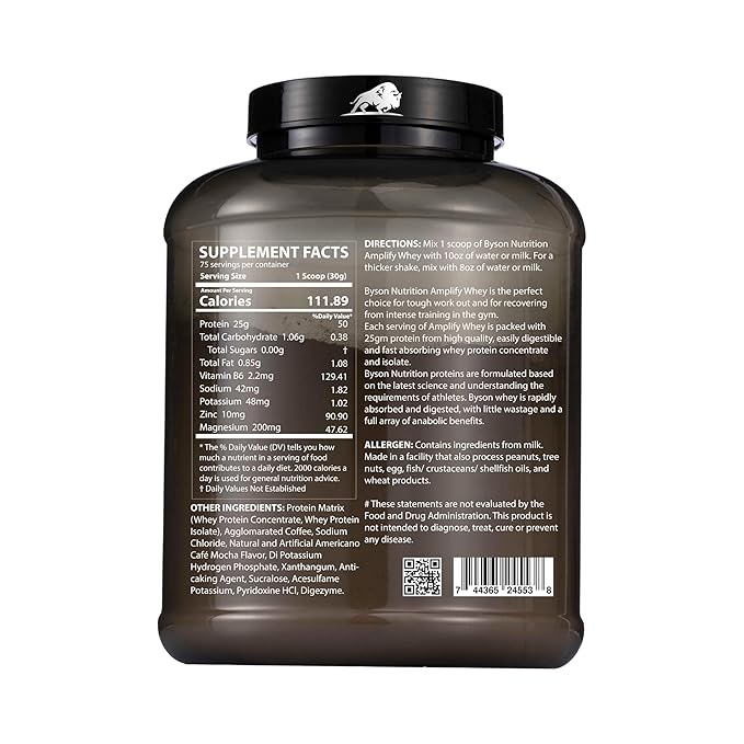 Whey Protein: BYSON NUTRITION Amplify Whey Protein Powder is crafted with premium whey protein, providing a rich source of essential amino acids for muscle growth and recovery.5 Lbs Container: Generous 5-pound size ensures a long-lasting supply, making it convenient for regular use and consistent protein supplementation.25g of Protein per Serving: Each serving delivers a potent 25 grams of protein, supporting muscle repair, recovery, and overall protein needs.
