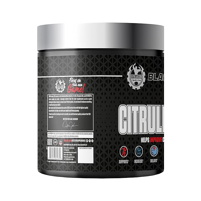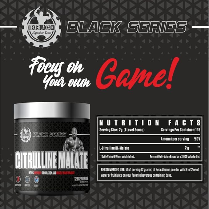 Dexter Jackson Black Series Citrulline Malate | 125 Servings, 250g - Premium Nitric Oxide Support for Improved Blood Flow and Workout Performance 125 Servings, 250g: Generous supply for prolonged support, providing 125 servings in each 250g container to enhance your workout performance. Improved Workout Performance Boost your training sessions with increased stamina, reduced fatigue, and heightened muscle pumps using Dexter Jackson's advanced Citrulline Malate formula.