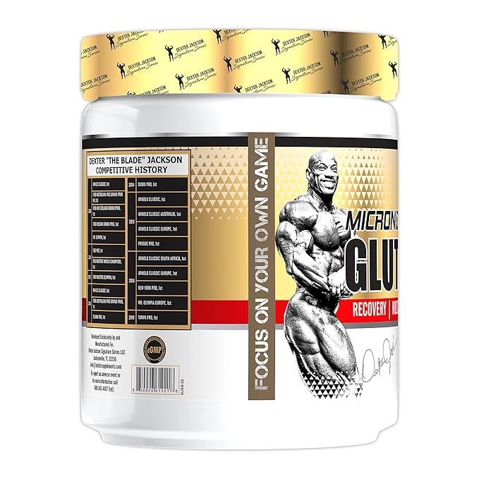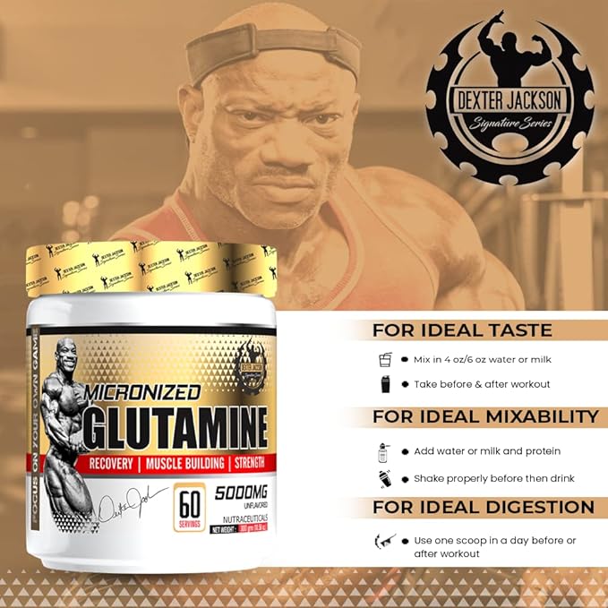 Dexter Jackson Glutamine is a supplement that contains the amino acid glutamine, which helps with muscle growth, protein synthesis, and immune function. It can also help with muscle soreness and recovery.