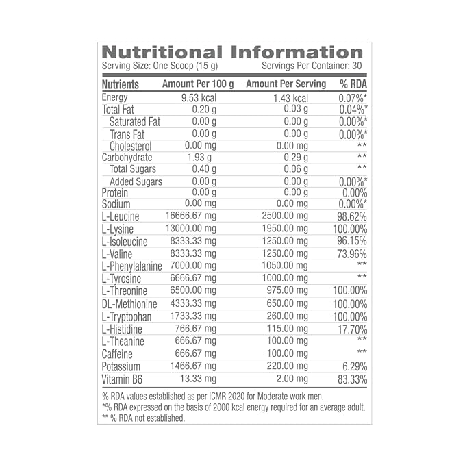 GNC Pro Performance Essential Amino Complete. It is formulated with 10g of all the nine essential amino acids and two important non-essential amino acids to offer complete amino-acid fuel for your muscles to feed on. This rich amino profile boosts your body's anabolic performance to swiftly help build muscle tissue and lean mass. The BCAAs in the formula are set at the 2:1:1 ratio, which is perfect for providing optimal conditions to maximise muscle gains and strengthen immune system. The amino acids are easily and quickly absorbed by the body to expedite muscle recovery and delay fatigue. GNC's EAA powder also contains 100mg of Caffeine that improves blood circulation and nutrient flow toward muscles. This improved flow amplifies the muscles' functional capacity to perform better. The caffeine also acts as a stimulator to help you stay focussed during workout. The potent amino acids are complemented by 2mg of Vitamin B6 that refills its depleted reserves for maintaining the workout rhythm. Furthermore, this EAA formula has added 220mg Potassium to replenish the used-up electrolytes for keeping each muscle cell well-hydrated. These muscles would then contract and relax smoothly without developing soreness. GNC’s EAA supplement comes in delicious flavours that would delight your taste buds with every sip. Plus, it contains zero added sugar for healthy consumption. "