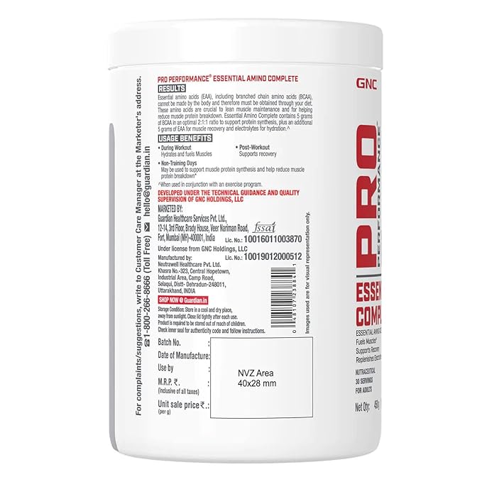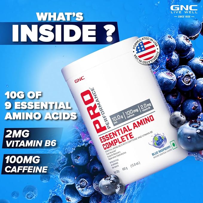 About GNC Pro Performance Essential Amino Complete | 450 gm | 30 Servings | Fuels Muscle Growth | Beats Fatigue | Prevents Muscle Cramps | 10g EAA | 100mg Caffeine | 2mg Vitamin B6 | Blue Raspberry