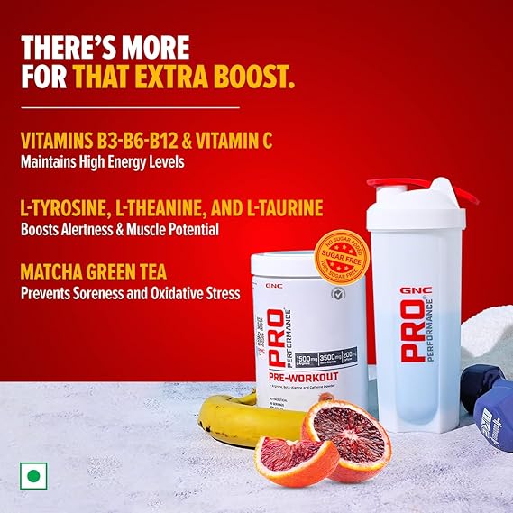 NC Pro Performance Pre-Workout Supplement (30 Servings). Formulated to power up your body and mind for a tougher routine, this superior pre-workout is made with a superior combination of clinically potent ingredients that collectively function as a power-packed fuel to shoot up your exercise performance and muscle gains. GNC’s Pre-Workout powder contains L-Arginine and L-Citrulline, which level up the Nitric Oxide yield to increase the flow of oxygen and blood towards muscles. This improved flow, in turn, ensures an uninterrupted energy supply and endurance boost to let you train harder without crashing. This powerful Pre-workout powder is enriched with Beta-Alanine & L-Creatine to speed up your muscle recovery and build your athletic strength to the highest level. It prevents fatigue from setting in and keeps you consistent all the way through the training. GNC’s Pre-Workout formulation also includes an optimum dose of Caffeine to help you stay completely alert and focussed on the workout task. Plus, it is packed with biologically crucial amino acids L-Tyrosine, L-Theanine, and L-Taurine, which amps up your nervous system to maintain the peak performance. This Pre-Workout powder is also formulated with a potent pair of antioxidants Beta-Alanine and Matcha Green Tea to prevent soreness and stop free radicals from damaging your muscles.