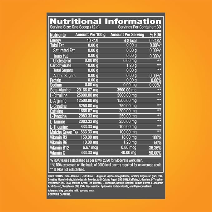 GNC Pro Performance Pre-Workout Supplement. Formulated to power up your body and mind for a tougher routine, this superior pre-workout is made with a superior combination of clinically potent ingredients that collectively function as a power-packed fuel to shoot up your exercise performance and muscle gains. GNC’s Pre-Workout powder contains L-Arginine and L-Citrulline, which level up the Nitric Oxide yield to increase the flow of oxygen and blood towards muscles. This improved flow, in turn, ensures an uninterrupted energy supply and endurance boost to let you train harder without crashing. This powerful Pre-workout powder is enriched with Beta-Alanine & L-Creatine to speed up your muscle recovery and build your athletic strength to the highest level. It prevents fatigue from setting in and keeps you consistent all the way through the training. GNC’s Pre-Workout formulation also includes an optimum dose of Caffeine to help you stay completely alert and focussed on the workout task. Plus, it is packed with biologically crucial amino acids L-Tyrosine, L-Theanine, and L-Taurine, which amps up your nervous system to maintain the peak performance. This Pre-Workout powder is also formulated with a potent pair of antioxidants Beta-Alanine and Matcha Green Tea to prevent soreness and stop free radicals from damaging your muscles. To preserve the muscle performance intensity, GNC’s Pre-Workout is loaded with Vitamins B3-B6-B12 along with Vitamin C to maintain high-energy levels and provide the nutritional aid required for the bodybuilding process. It also contains L-Tyrosine, L-Theanine, and L-Taurine, which sustain the vitality to keep your mind and body occupied in the training. GNC’s Pre-workout supplement is an absolute delight for your taste buds. It comes in multiple delicious flavours that will make every sip worth savouring. Moreover, it is free from added sugar for healthier consumption. "
