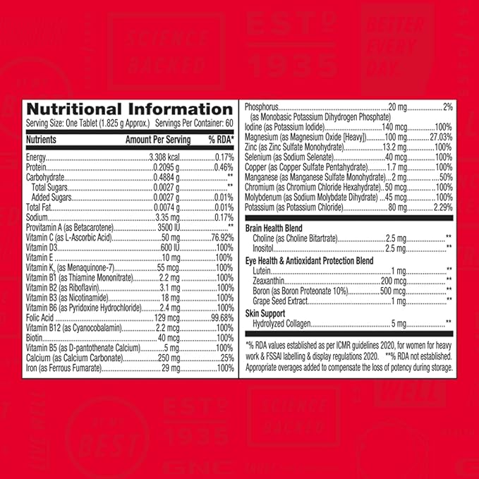 GNC Women One Daily Multivitamin Crafted with 32 premium ingredients like Vitamin C, Biotin, and Zinc, this multivitamin is your complete solution for women’s daily health and vitality.Stronger Immunity Enriched with 100% RDA of Vitamin C, D3, and Zinc, this formula helps build a robust immune defense to keep you healthy and active.𝗕𝗼𝗼𝘀𝘁𝘀 𝗘𝗻𝗲𝗿𝗴𝘆 𝗳𝗼𝗿 𝗮𝗻 𝗔𝗰𝘁𝗶𝘃𝗲 𝗟𝗶𝗳𝗲𝘀𝘁𝘆𝗹𝗲 Powered by B-complex vitamins and Iron, it fights fatigue and provides sustained energy to keep you on top of your game all day long.