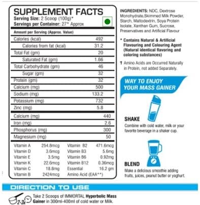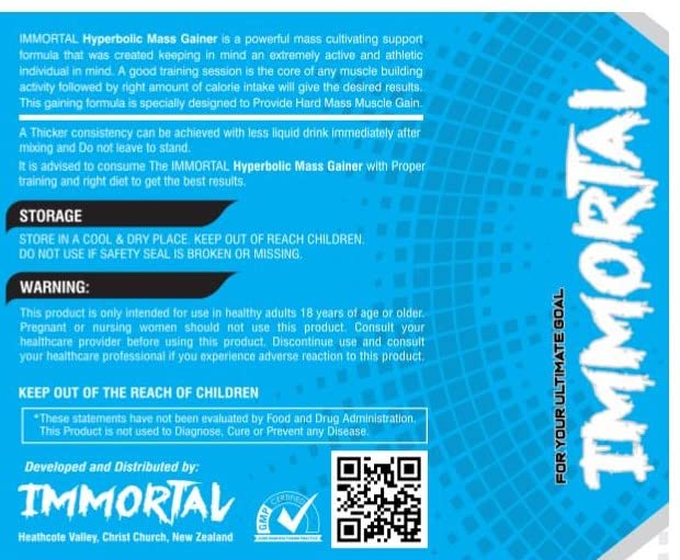 Immortal Hyperbolic Mass Gainer Hyperbolic Mass Gainer is manufactured at GMP certified facility where the equipments verify for accuracy, purity and potency of every ingredient. The Powerful Mass cultivating Formula to achieve the desired body by an active and athletic Individual