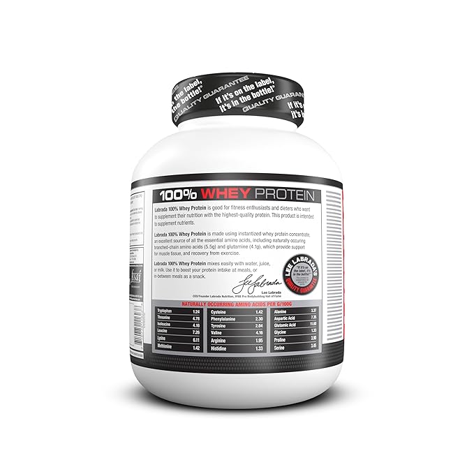 Labrada 100% Whey Protein is made using instantized whey protein concentrate, an excellent source of all these essential amino acids, including naturally occuring branched-chain amino acid (5.5g) and glutamine (4.1g) which provide support for muscle tissue and recovery from exercise.