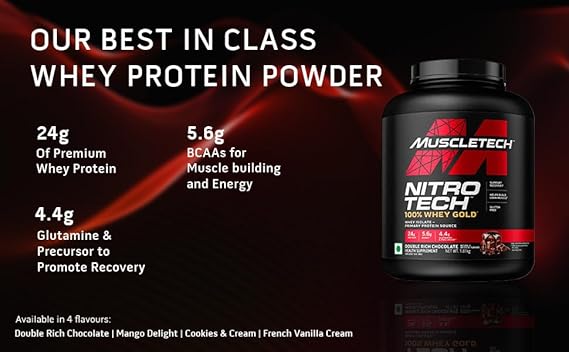 About MuscleTech Performance Series Nitro Tech Whey Gold| 24g Protein| With BCAA and Glutamine and Precursors |For Lean Muscle Gain| Sports Nutrition | 5.03 lbs (2.28 Kg) | Double Rich Chocolate Flavour
