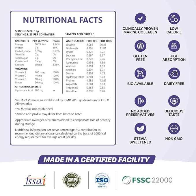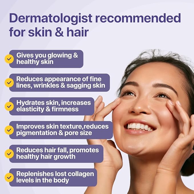 Nature's Island Collagen Skin Formula is a complete and effective solution for your beauty that helps in achieving healthy skin, hair & nails. It contains clinically approved marine collagen peptides (9G collagen per serving), hyaluronic acid (HLA), biotin, vitamin A, vitamin C & vitamin E. Suitable for beauty conscious women & men. Collagen skin formula is made using clinically approved TYPE 1 marine collagen peptides which is 1.5 times better than other sources due to it's?low molecular weight and high absorbing quality. It has been clinically proven to improve skin texture & glow, boost skin health, reduce hair fall, improve dryness, dullness, hair breakage, reduce signs of ageing, improve nail strength and nail health in 90 DAYS. GLOWING, YOUTHFUL AND RADIANT SKIN Collagen helps increase skin elasticity, moisture and skin regeneration. It also helps in reducing the appearance of fine lines, wrinkles. Vitamin C & Vitamin E help reduce dullness, increase skin glow, improve uneven skin tone, promote collagen synthesis, decrease UV damage on skin and fight the effects of free radicals produced by pollution and sun damage.