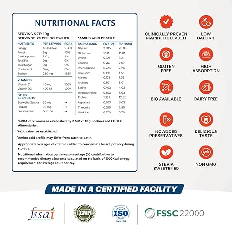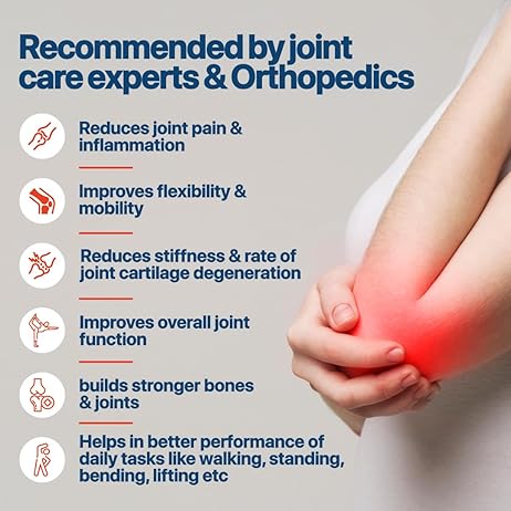 Hydrolyzed collagen powder provides elasticity and structure for the bone tissue, which improves joint flexibility, reduces inflammation & provides better overall joint functionality.The combination of herbs like glucosamine hcl with boswellia & hadjod with collagen peptide helps in smoother joint functioning thereby easing daily tasks like walking, stair climbing and descending, rising from sitting, standing, bending and weight-bearing Helps in alleviating pain resulting from osteoarthritis.Collagen joint support provides Strength to bones and joints which can minimize the risk for future injuries.