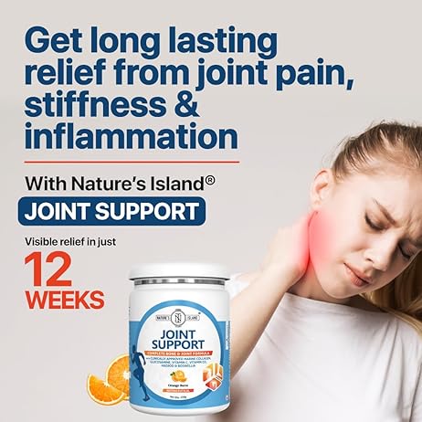 About Nature Island Joint Support Supplement with Marine Collagen, Glucosamine, Boswellia, Hadjod, Vitamin D3 and C for Cartilage, Bones and Joints | Relieves Joint Pain, Inflammation and Stiffness | 250g (Orange)