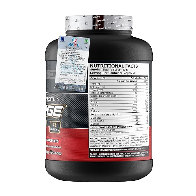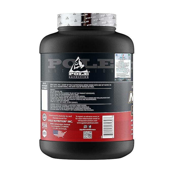 Advanced Whey Isolate Formula Unleash the power of Pole Nutrition Nitro Verge, featuring advanced whey isolate proteins to elevate your muscle-building and recovery experience. Rich Chocolate Flavor Indulge your taste buds with the decadent richness of chocolate, making each protein-packed serving a delicious treat for your senses. 5lbs of Pure Protein Goodness With a substantial 5-pound container, Nitro Verge provides an ample 76 servings of pure, high-quality whey isolate for sustained muscle nourishment.