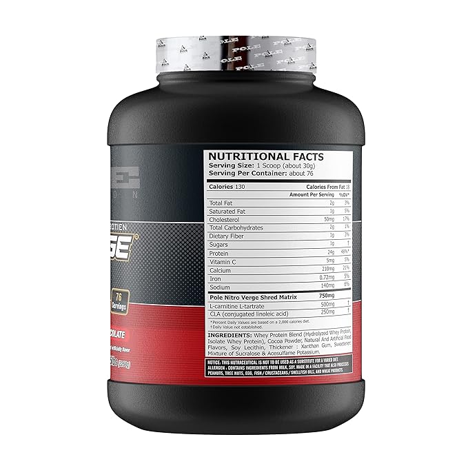 Advanced Weight Loss Formula Experience the power of Pole Nutrition Nitro Verge Shred, an advanced formula meticulously crafted to support your weight loss goals with precision. Rich Chocolate Flavor Indulge in the decadent richness of chocolate as you transform your weight loss journey into a flavorful and satisfying experience. Extended Supply With a substantial 5-pound container, Nitro Verge Shred provides a generous 76 servings, ensuring a long-lasting supply for consistent support.