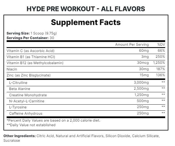 For all the Mental Focus, Drive, Endurance, and Stamina you need to crush your training sessions start right here. Developed to be one of the best pre workout experiences available, HYDE Pre Workout uses 500mg of N-Acetyl-L-Carnitine, B Vitamins, L-Tyrosine, and Caffeine for incredible focus and energy. With 3,000mg of L-Citrulline for Nitric Oxide production to increase blood flow and 3,200mg of Beta-Alanine to help push past the point of exhaustion, HYDE Pre Workout will help you reach a new level of stamina. Finally, 1,250mg of Creatine Monohydrate will promote muscular development. HYDE Pre Workout will have you entering the gym with purpose and leaving knowing you EARNED IT!